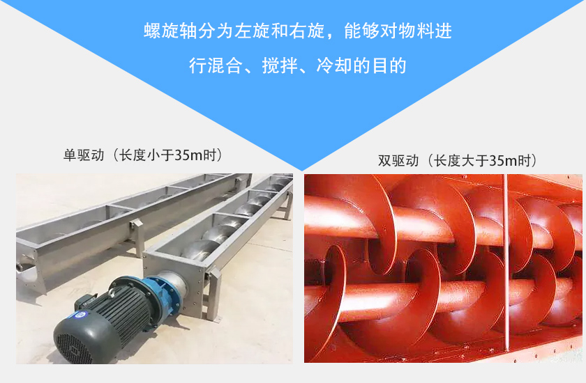 絞龍螺旋輸送機主(zhǔ)要是由機架(jià)、進出口裝置、驅動裝置(減速機(jī)或電機)、螺旋軸、螺旋葉片、軸聯(或鏈輪、鏈條或皮帶輪、三角帶)、頭(tóu)節、中間節、軸承座、吊軸(zhóu)承、尾節等不等組成。