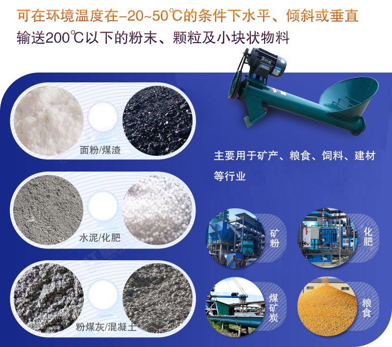 螺旋給料機主要(yào)用於(yú)礦產、糧食、飼料、建材等行(háng)業,可在環境溫度在-20~50℃的條件下水平、傾斜或垂(chuí)直輸送200℃以下的粉末、顆粒及小塊狀物料,如:麵粉、煤渣、粉煤灰、化肥、水泥、混凝土等物(wù)料。
