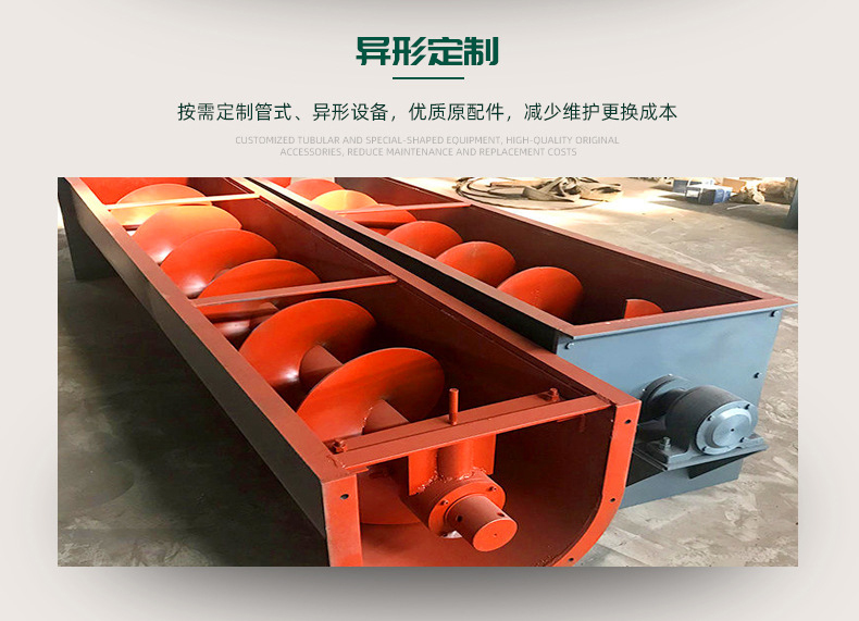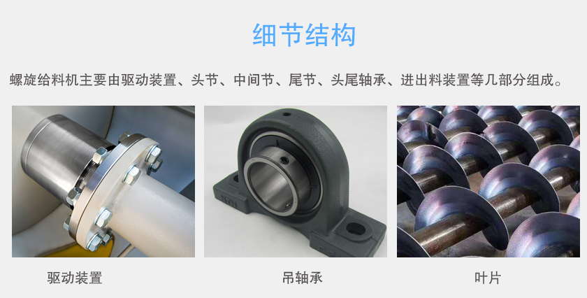 螺旋給料機主要由驅動裝置、頭節、中間節、尾(wěi)節、頭尾軸承、進出料裝置等幾部分組成。